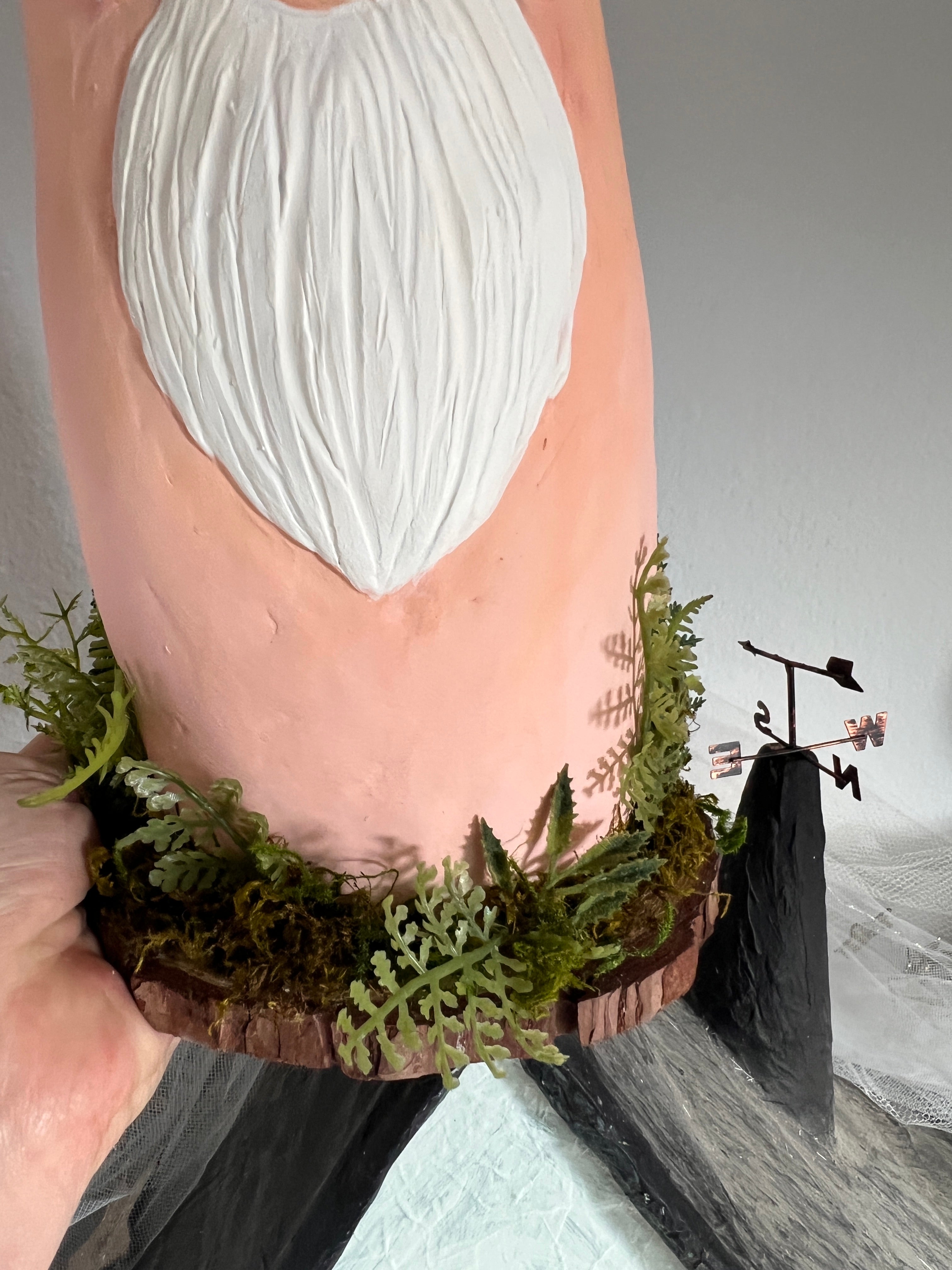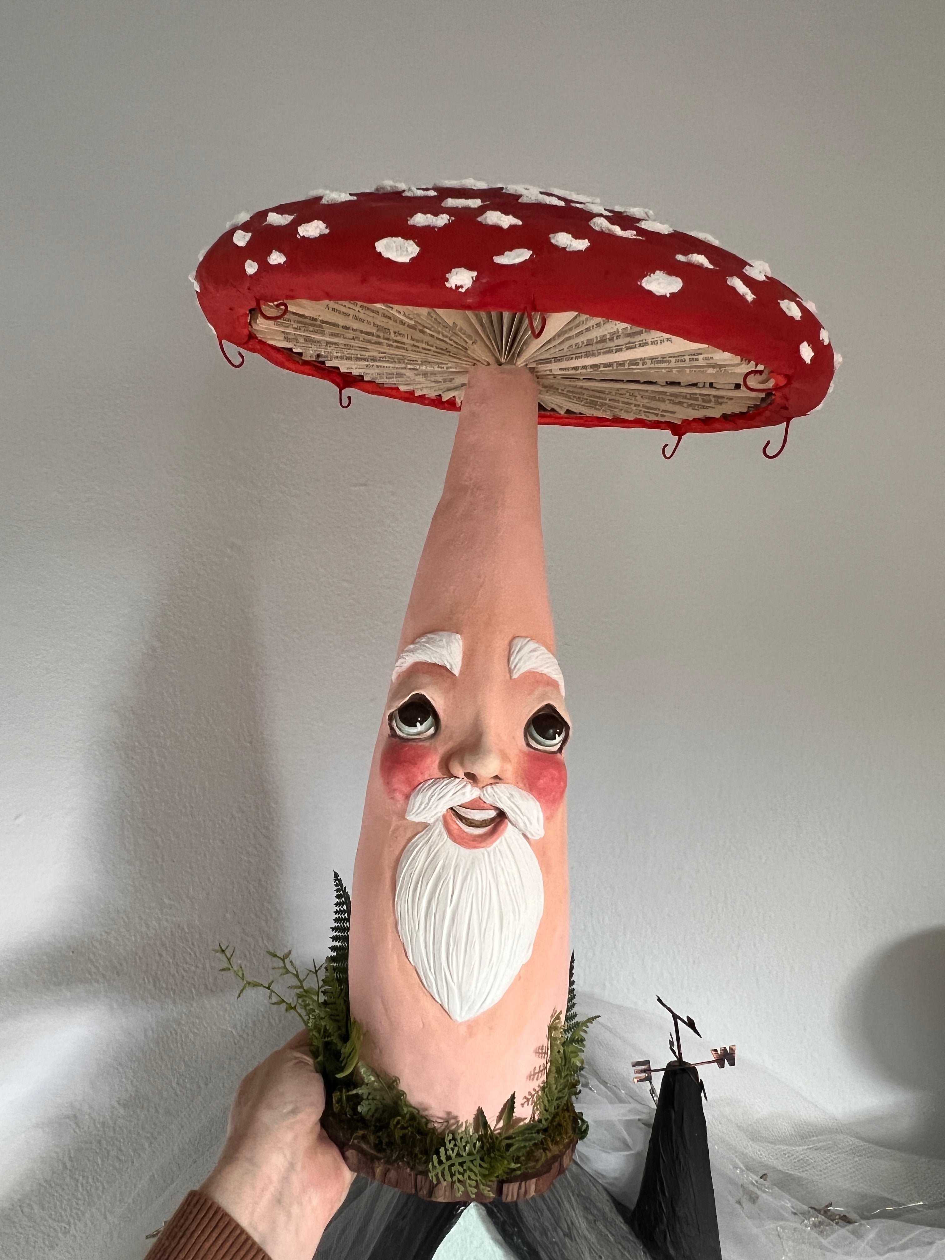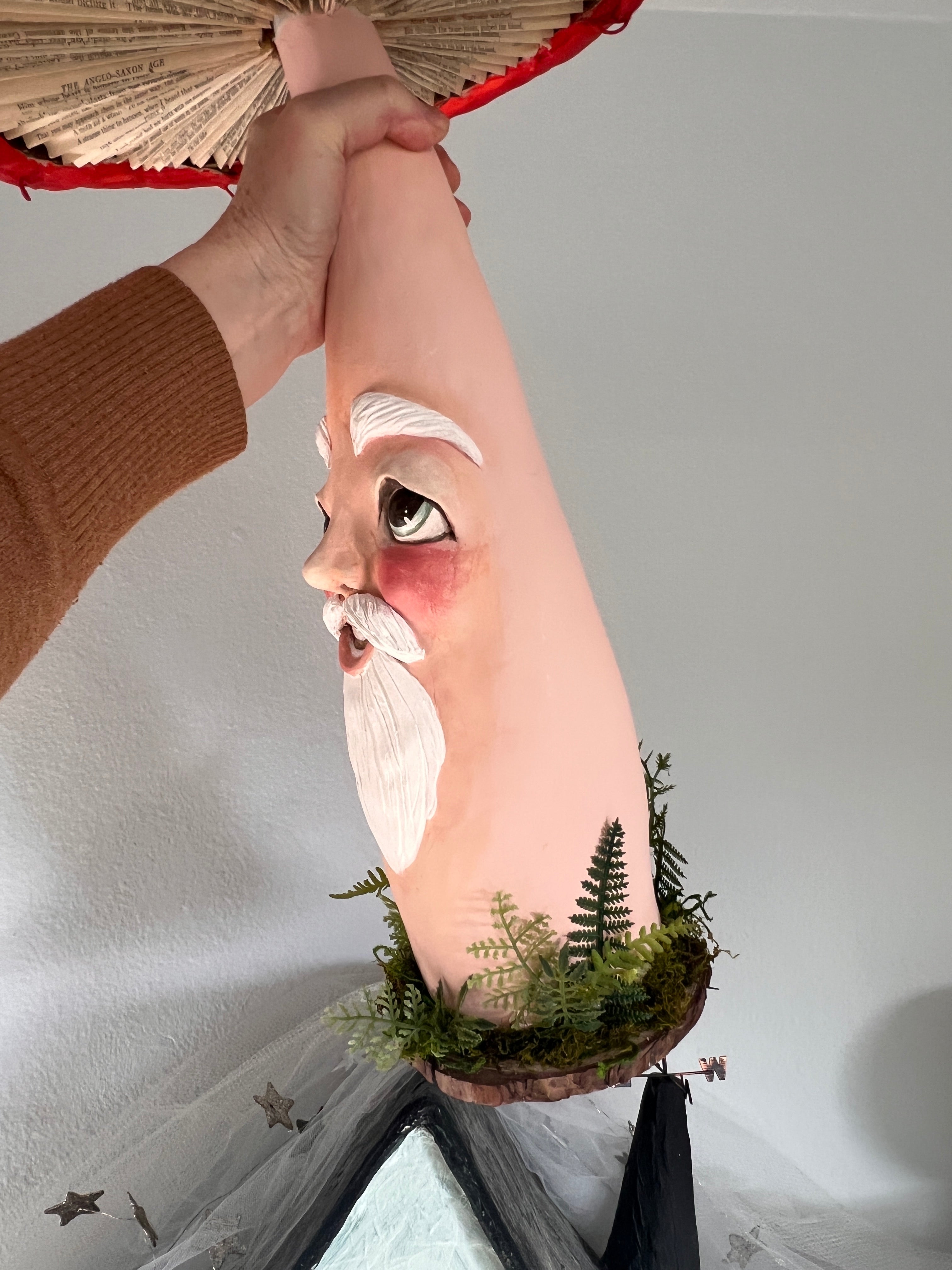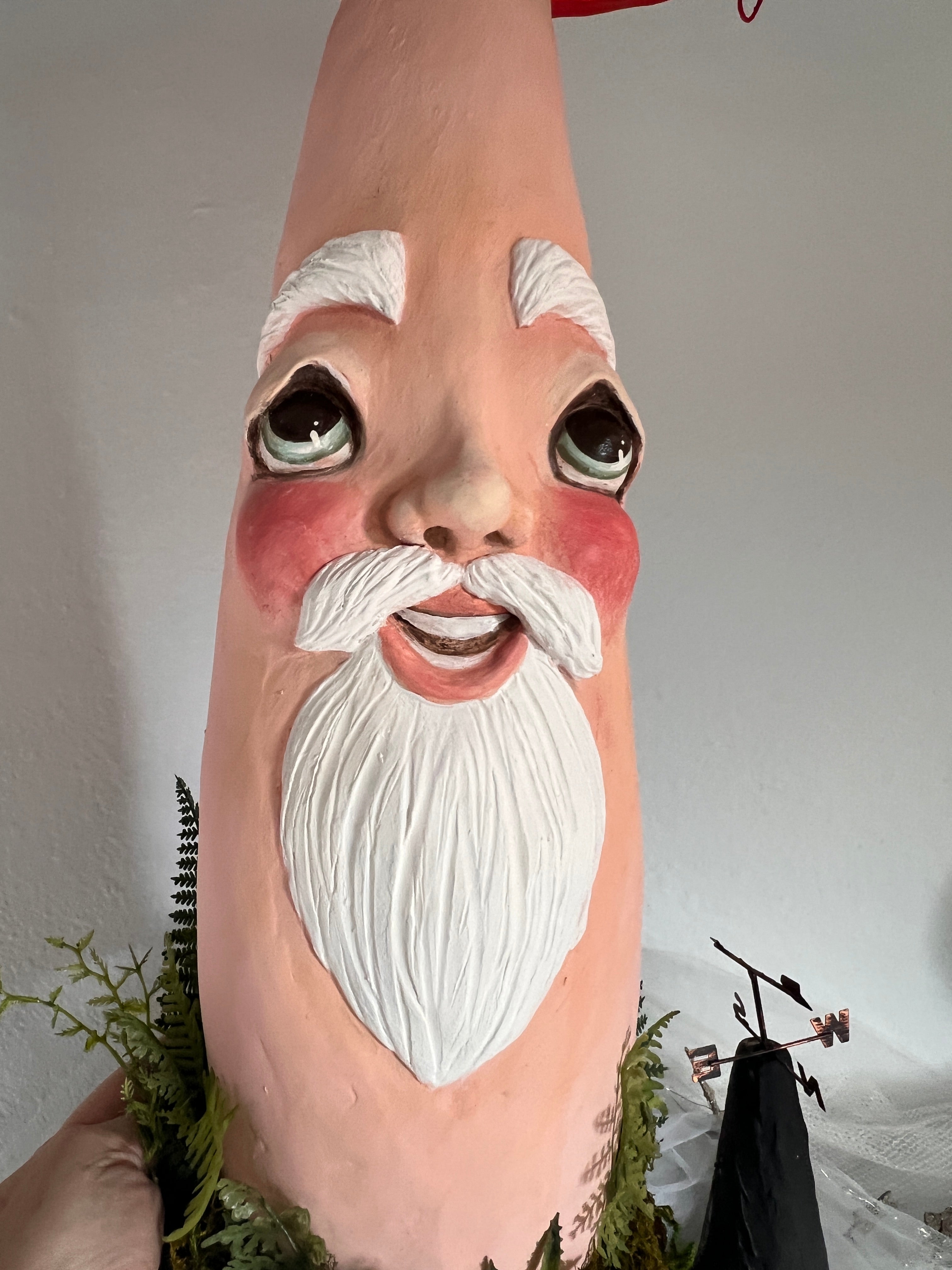 I started this fella back in 2023. He has evolved tremendously from where he started. In fact, I’ve tore him apart a few times Until his personality appeared. He is almost solid clay over a skeleton I built and he weighs several pounds. His cap is made out of cardboard paper and spun cotton. There are eight wires around the underside of his cap where you can dangle a garland, lights or small Ornaments.
