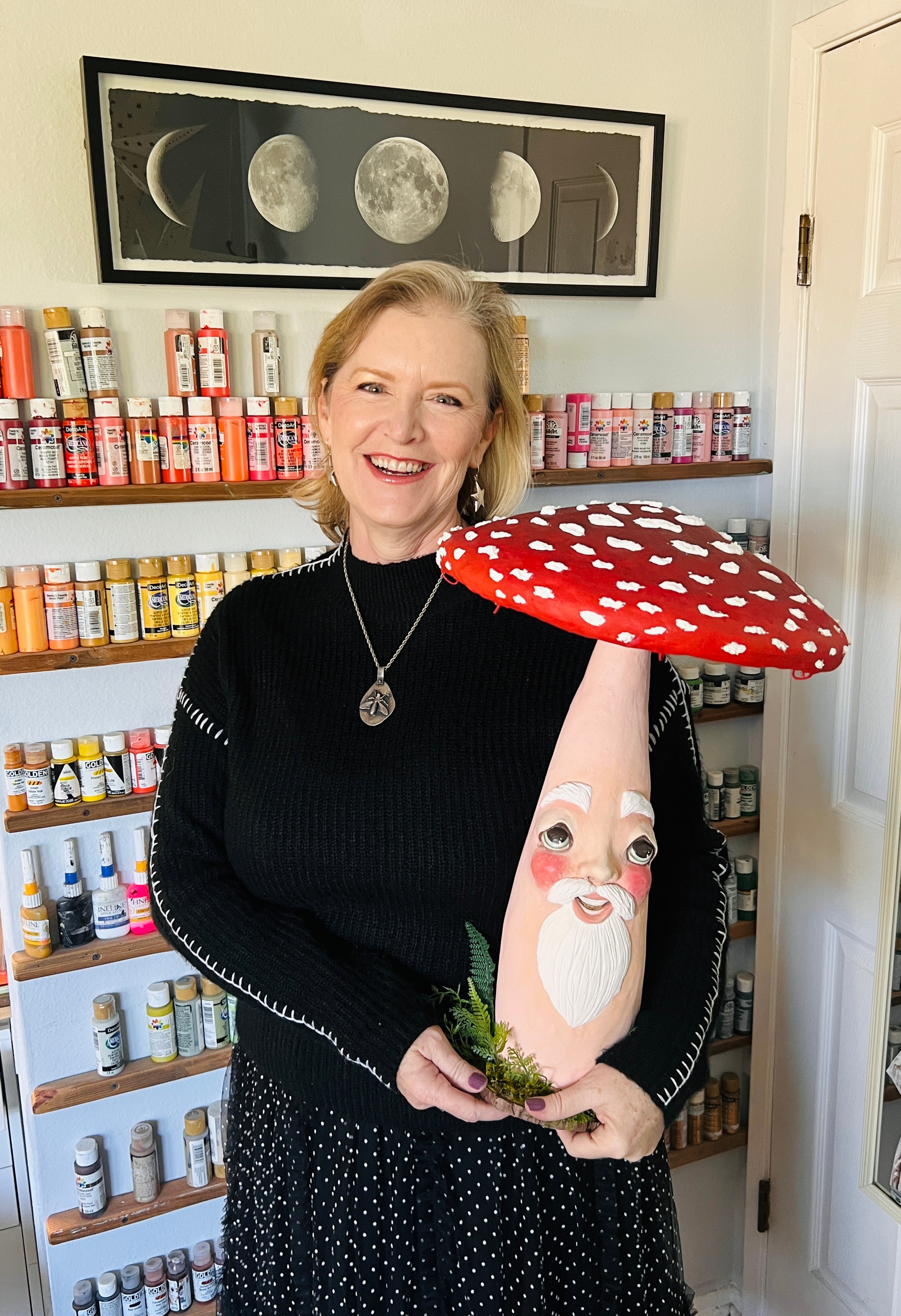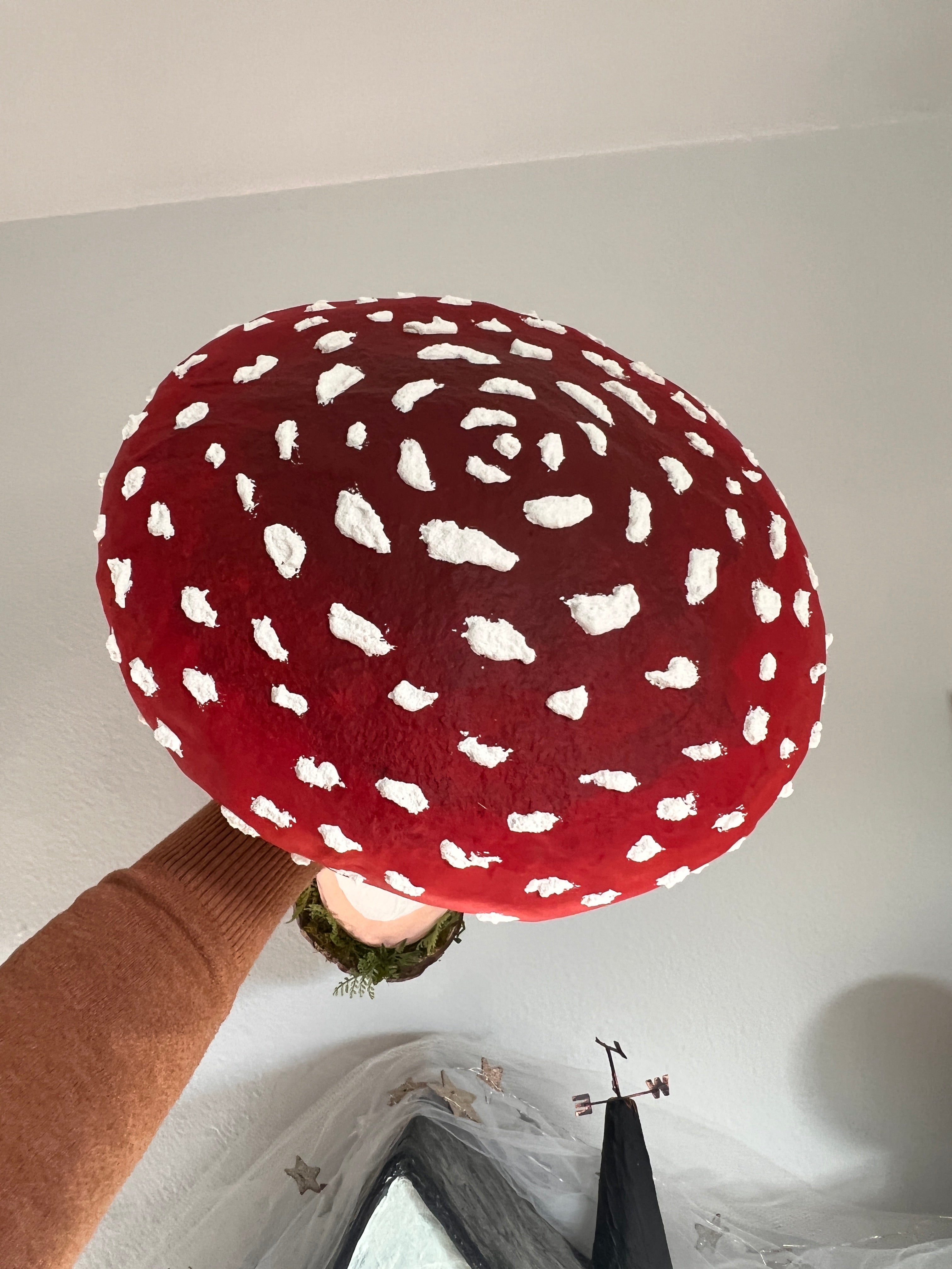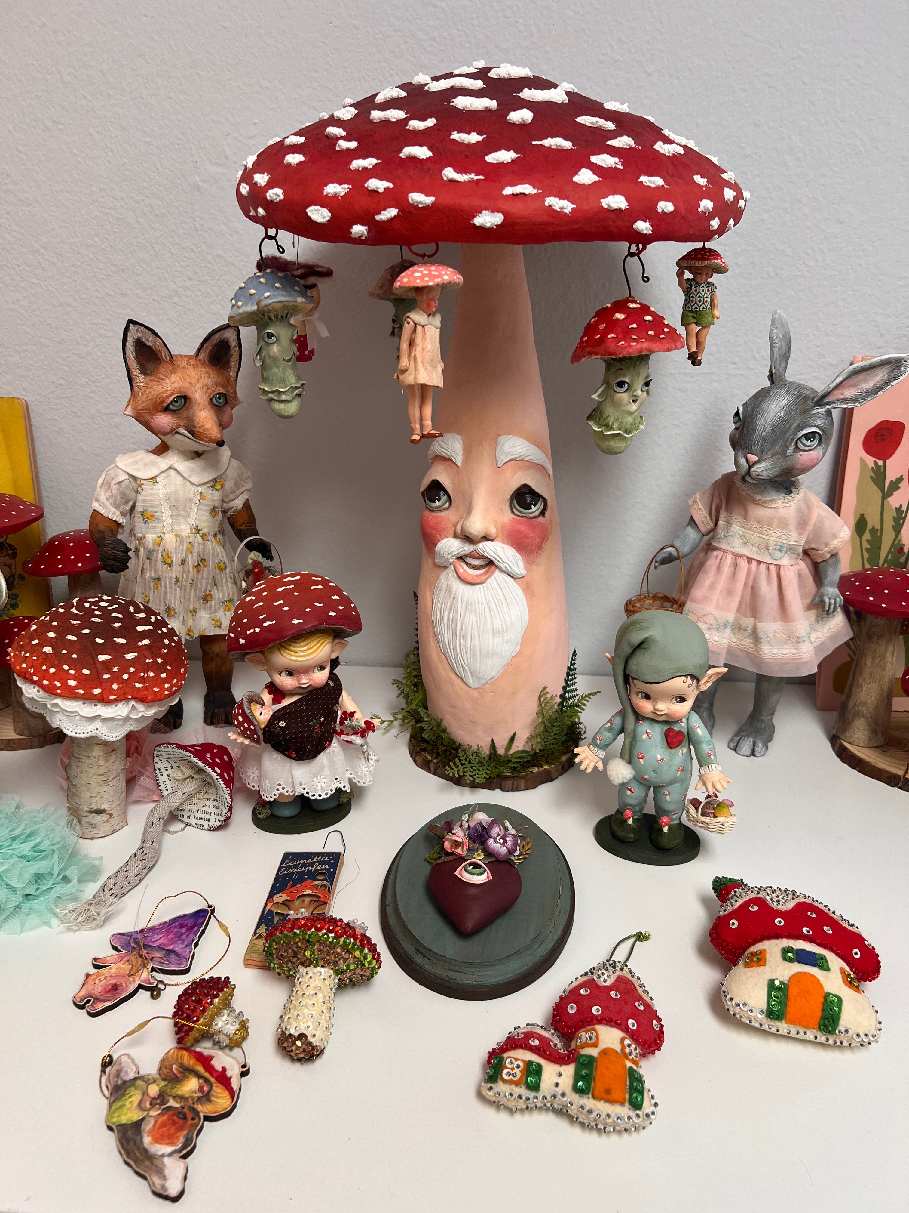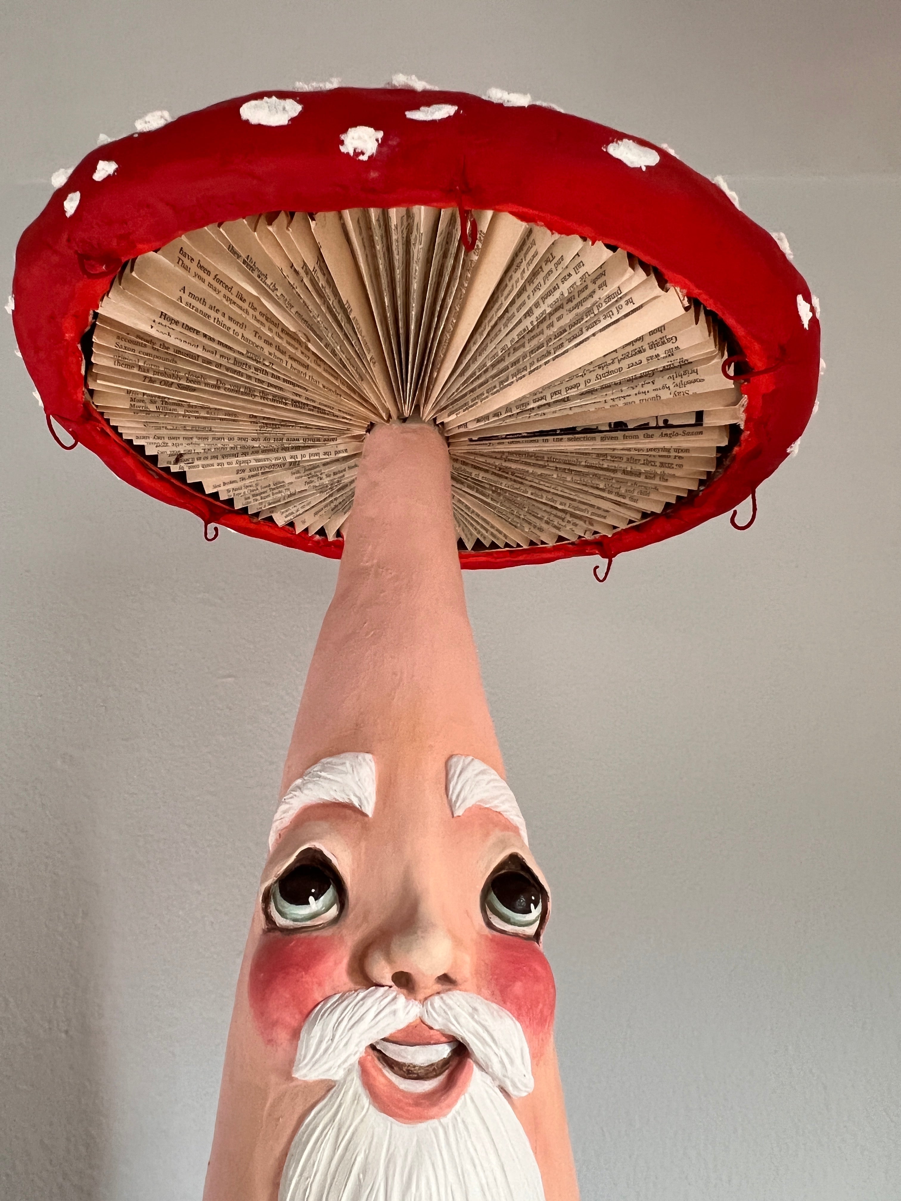 I started this fella back in 2023. He has evolved tremendously from where he started. In fact, I’ve tore him apart a few times Until his personality appeared. He is almost solid clay over a skeleton I built and he weighs several pounds. His cap is made out of cardboard paper and spun cotton. There are eight wires around the underside of his cap where you can dangle a garland, lights or small Ornaments.