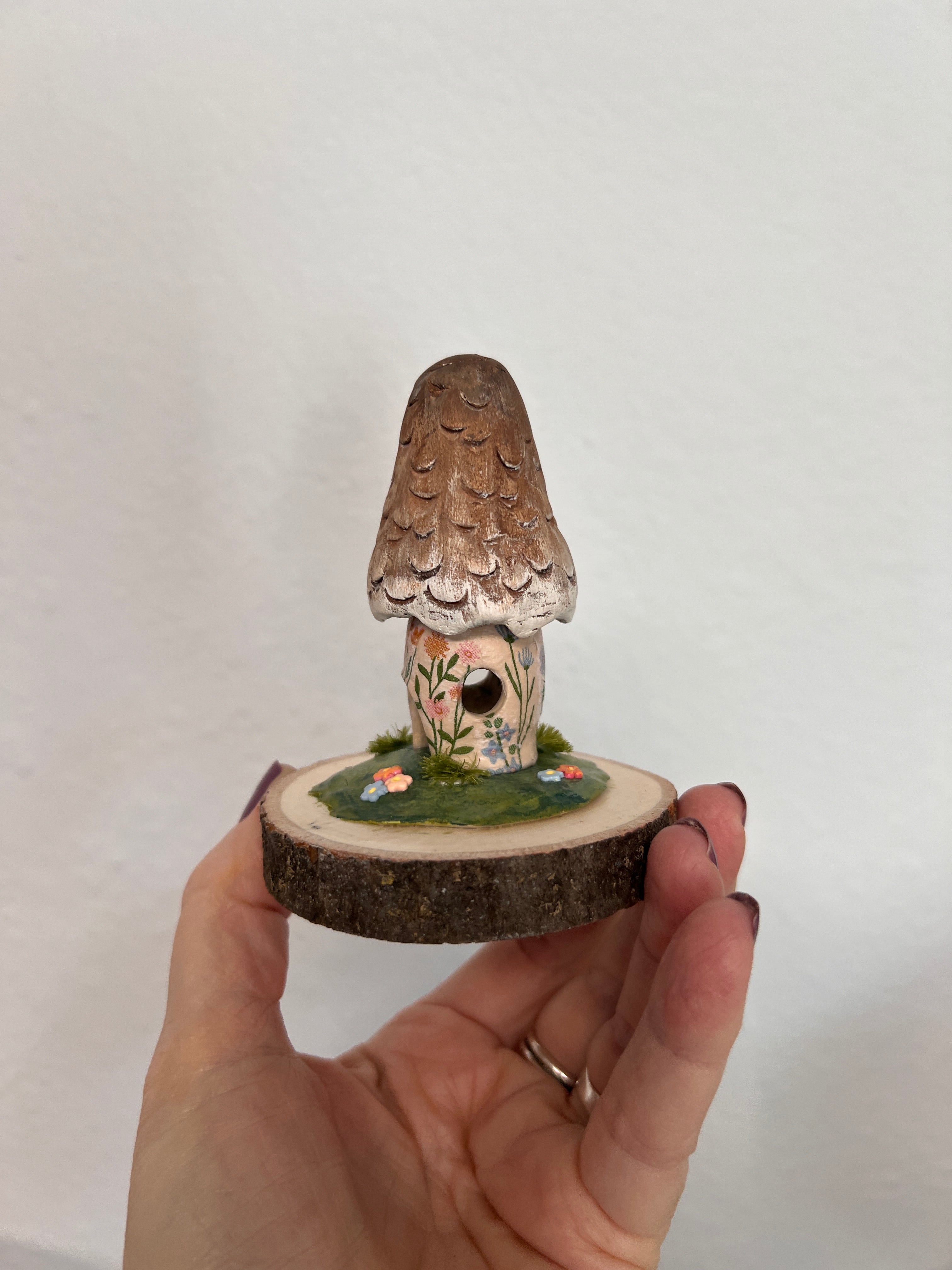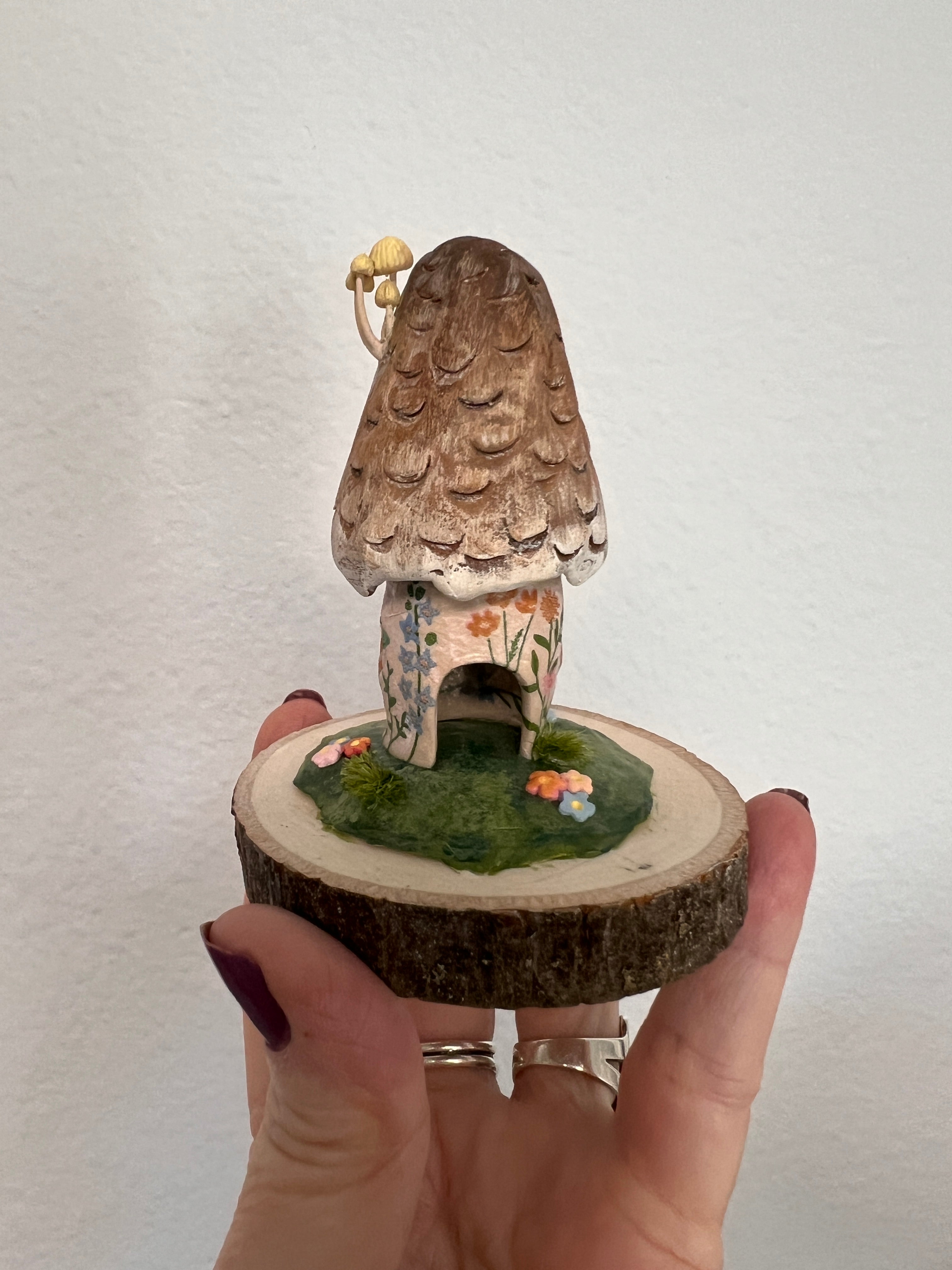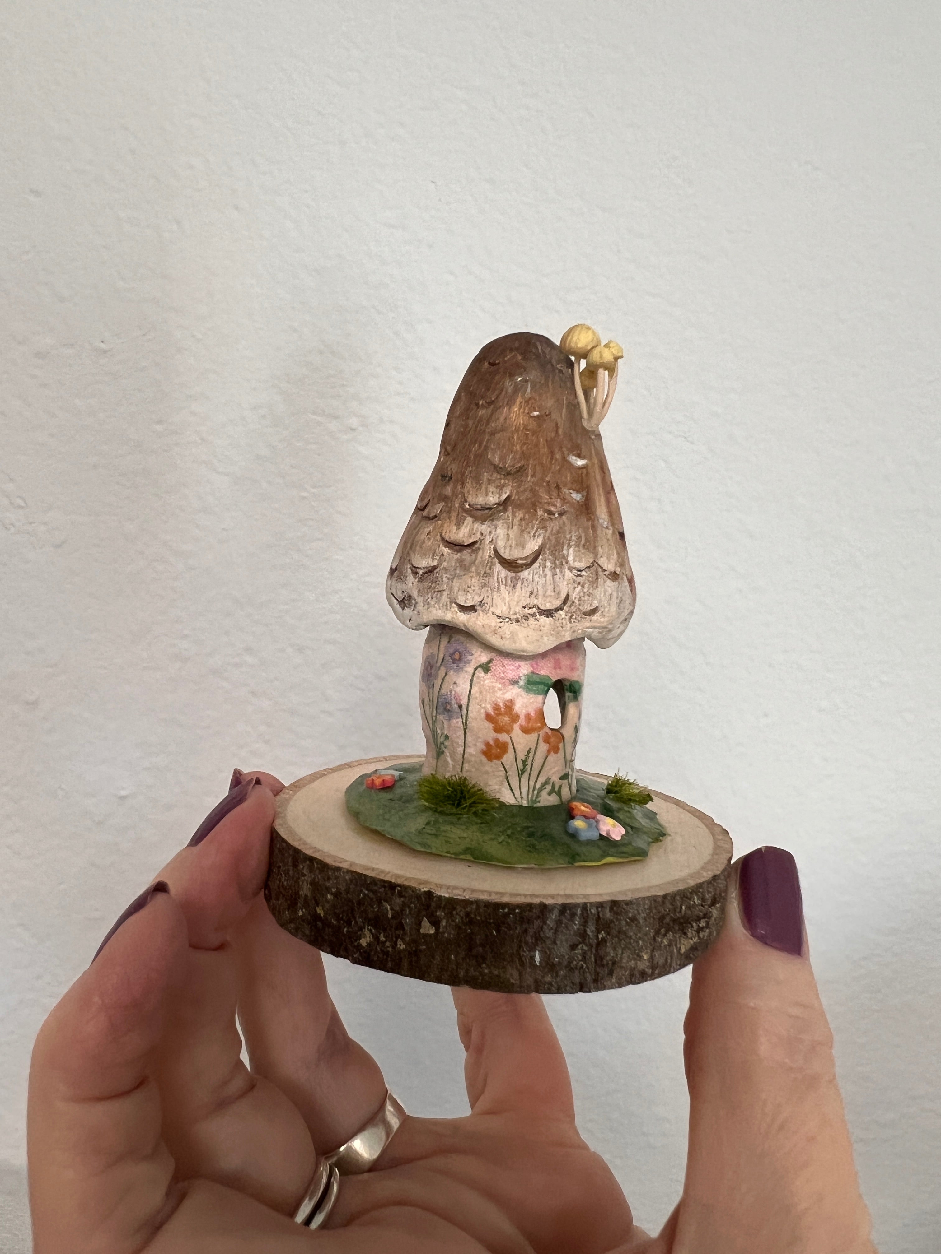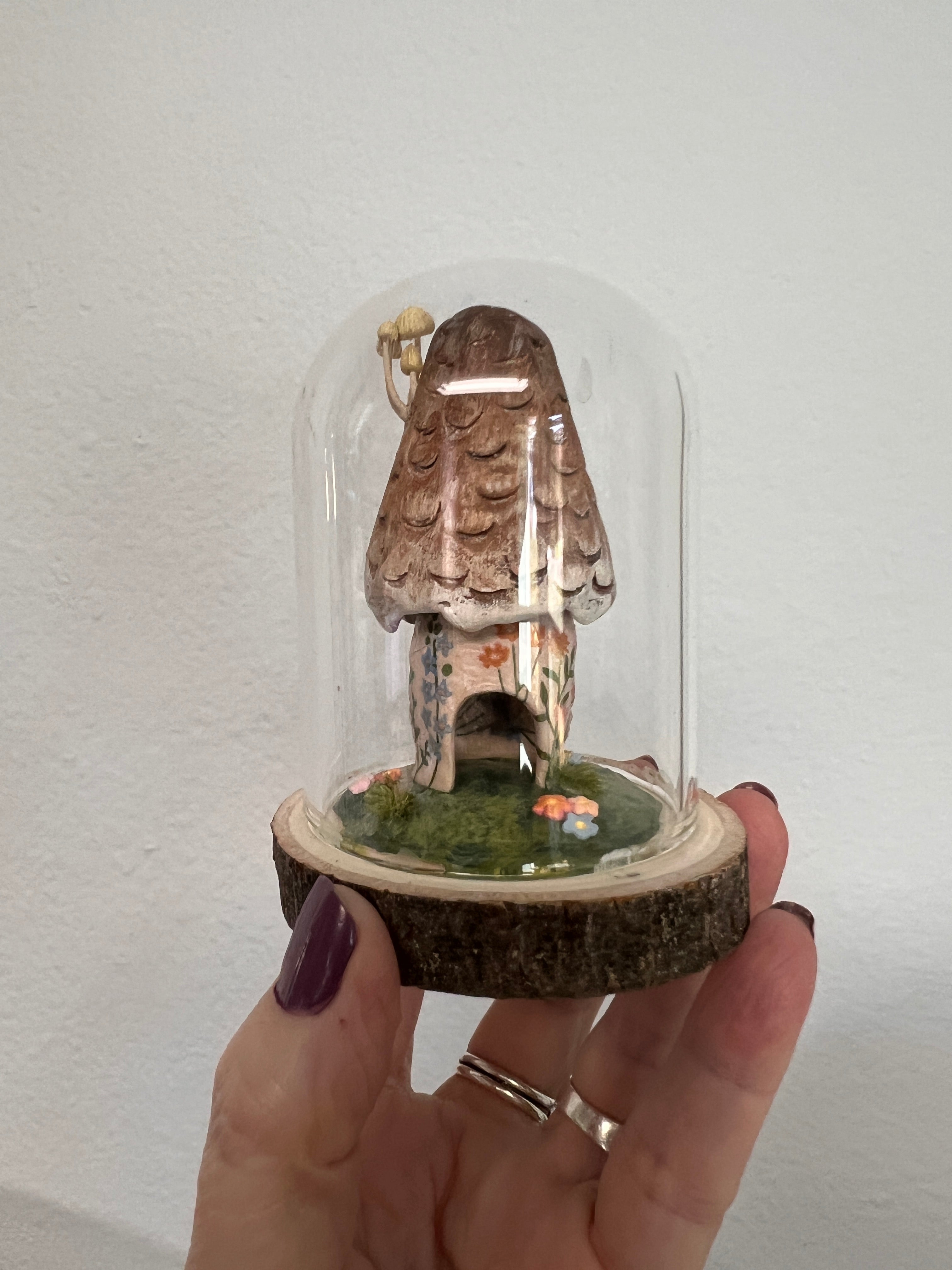 this sweet little mushroom cottage is made out of paper clay. I had the most delicate paper to decoupage on her sides. She is hand painted in acrylics and all of the tiny flowers on her base I make out of polymer clay. She does come with her little glass dome also.