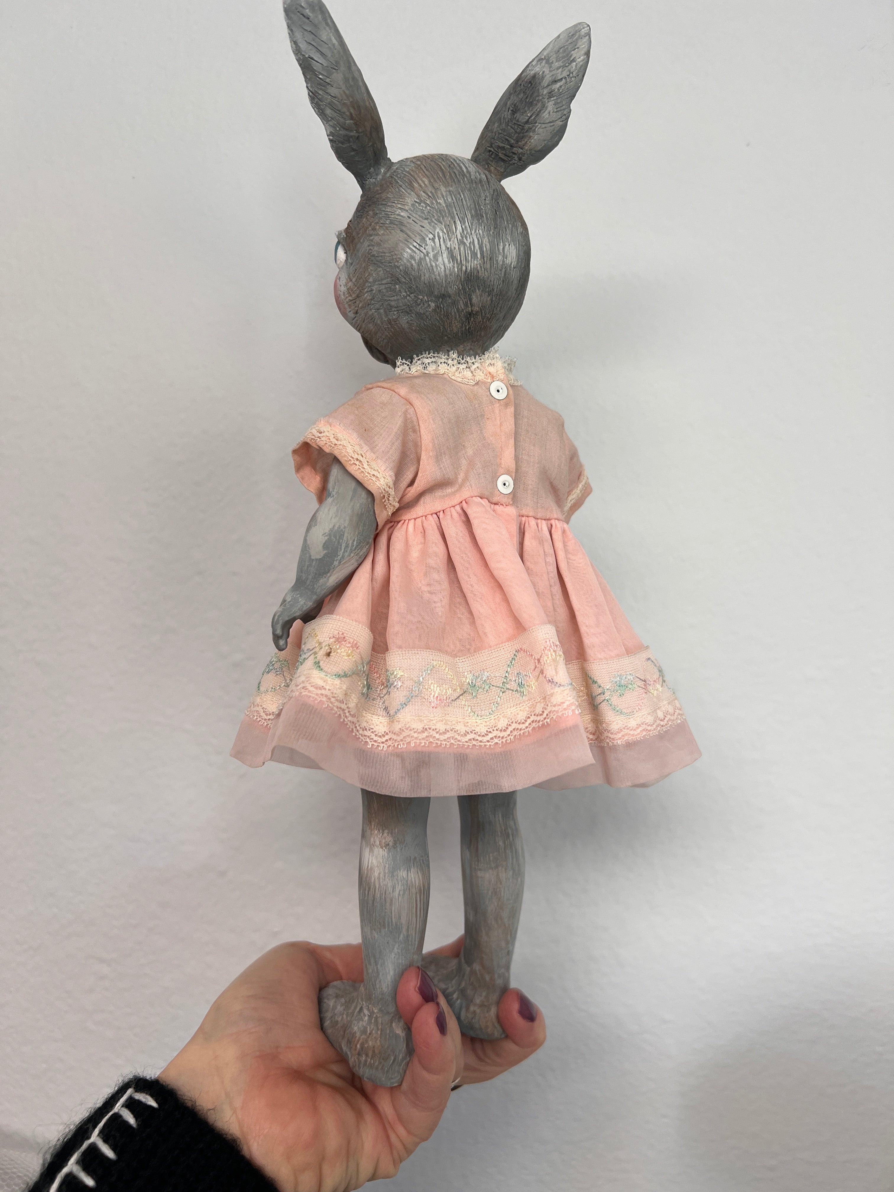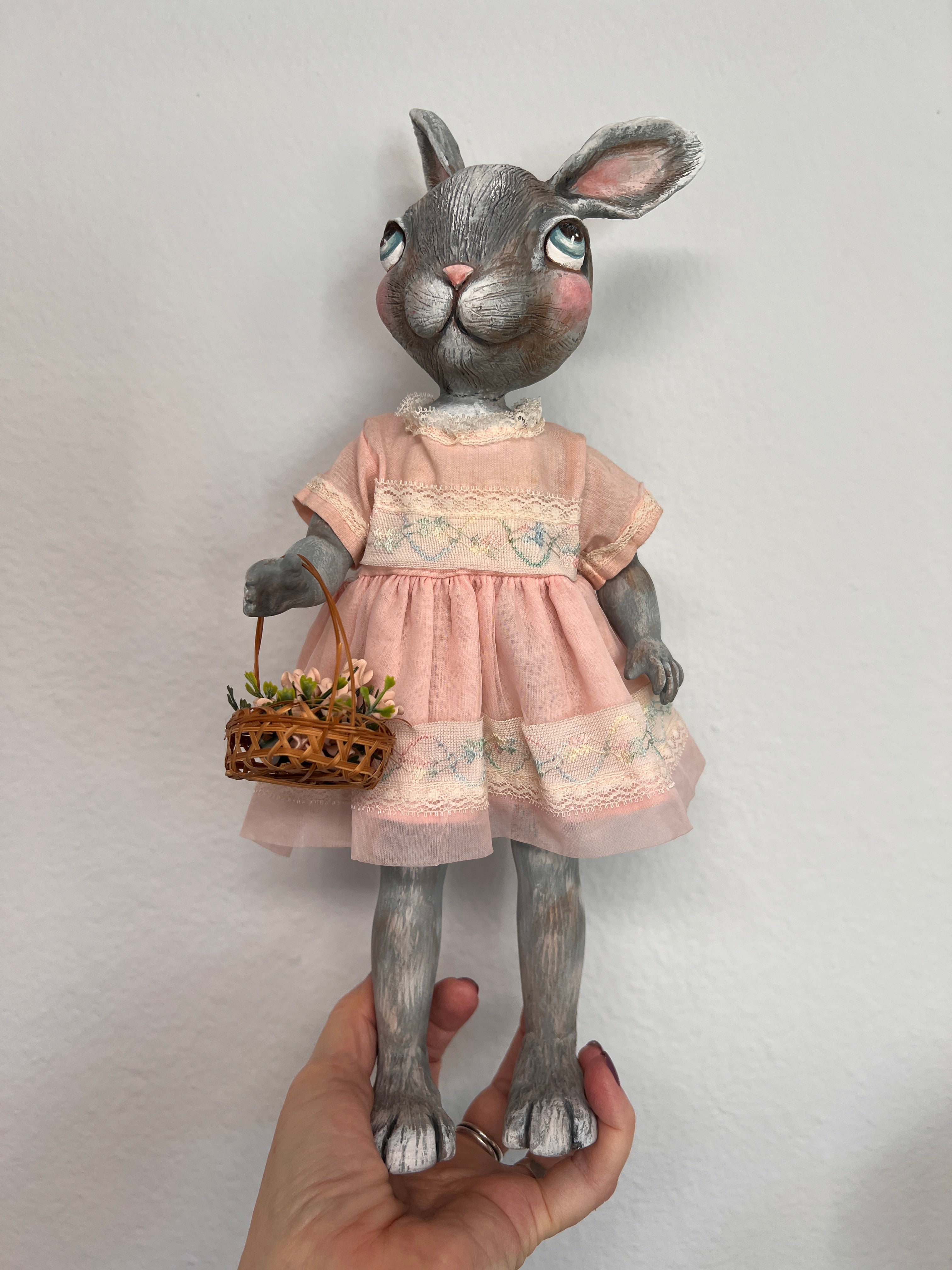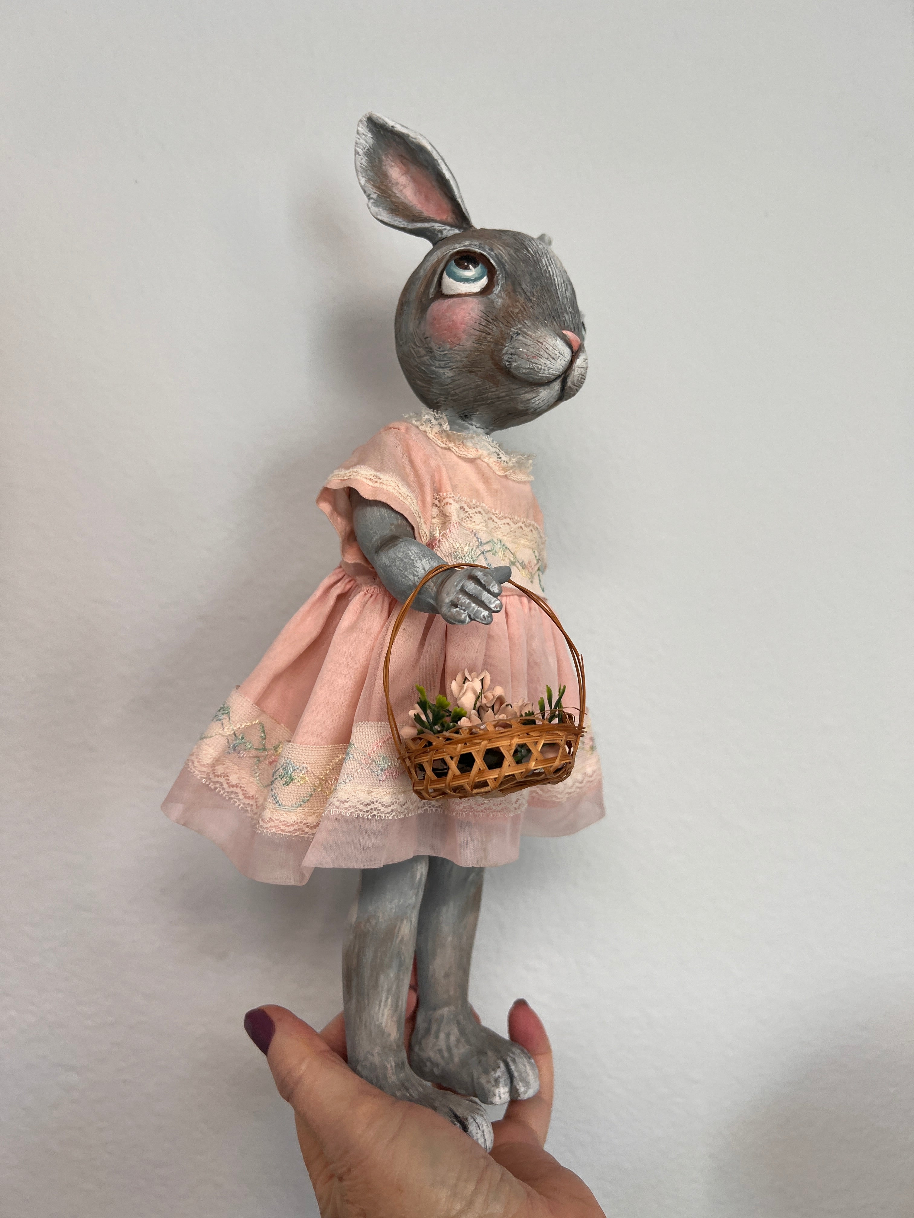 I Created this girl about 5 years ago. She is a combination of a vintage porcelain doll, epoxy resin clay and paper clay. She wears a vintage dress that I altered and holds a little vintage basket with porcelain roses.. What I love about this piece is she free stands because she is perfectly balanced. She stands 13 inches tall.