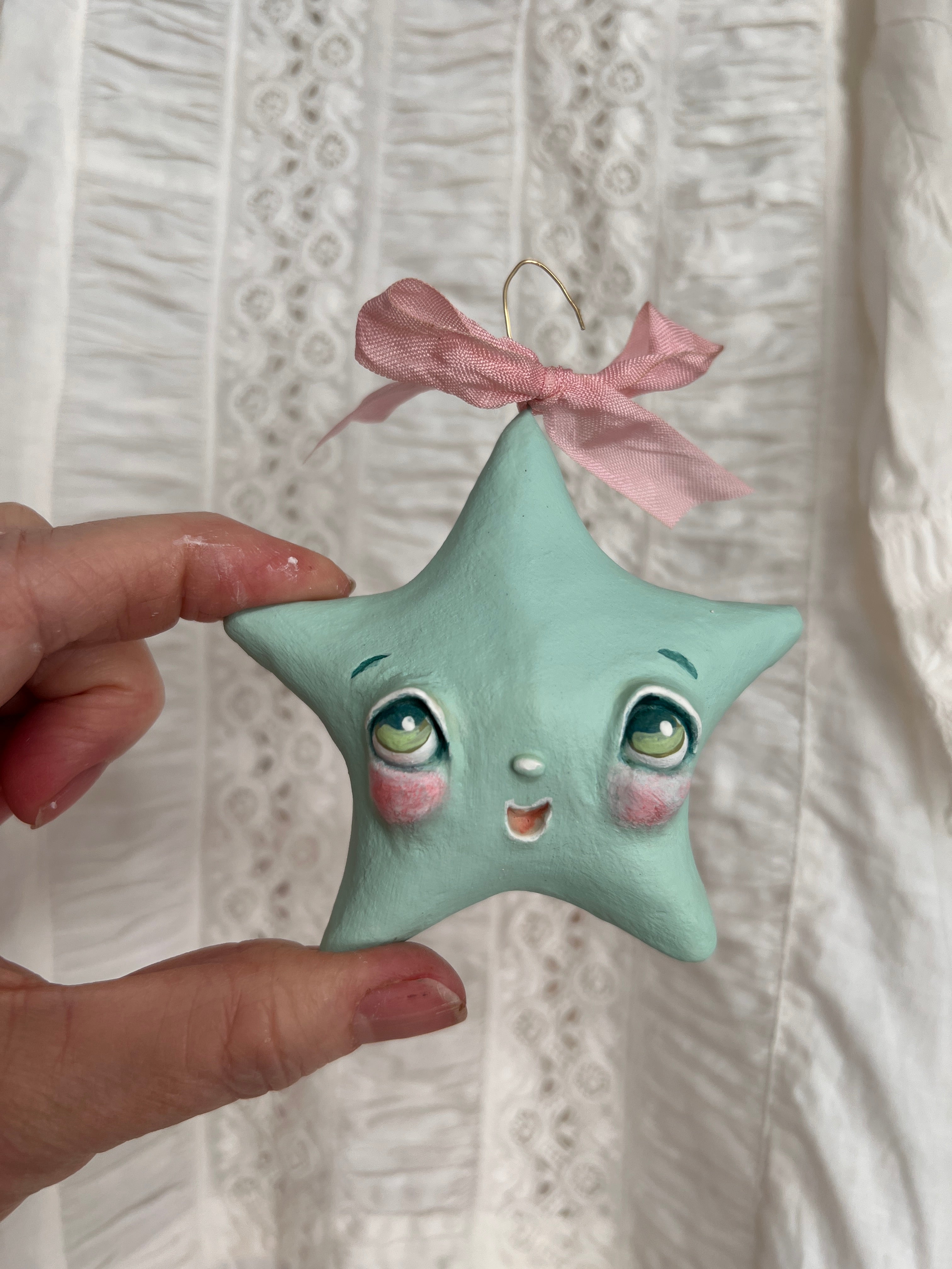 I think stars might now be my favorite thing to sculpt besides moons. And this little aqua twinkle star is just the cutest freaking thing. These are a little bit smaller than my regular sculpted ornaments. They are made from paper, clay painted in acrylics, sealed and signed.